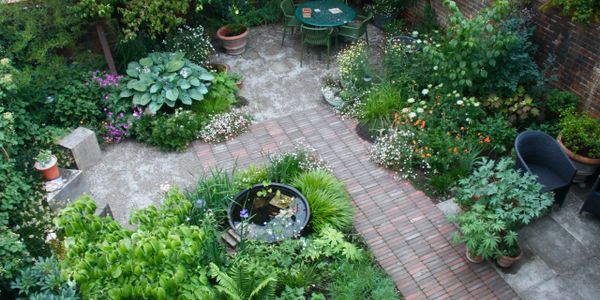 Reclaimed materials—salvaged paving, clay pavers and crushed concrete—form a cohesive, tonally sympathetic hardscape.